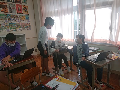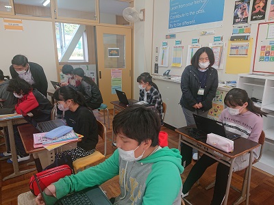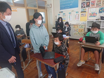 6年生は英語で、Chromebook(クロームブック)を使って英文の早読みを行っていました。ALTも一緒に支援していました。また、この授業にはALT派遣会社の職員が参観しました。