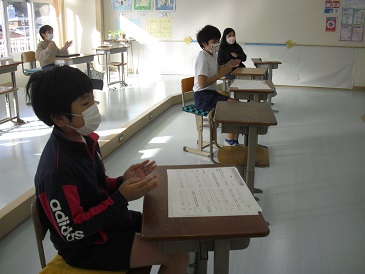 5年生は音楽で「ボディパーカッション」について学習しています。リズムに合わせて、拍手や膝をたたくなど、楽しみながら演奏していました。