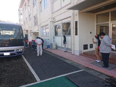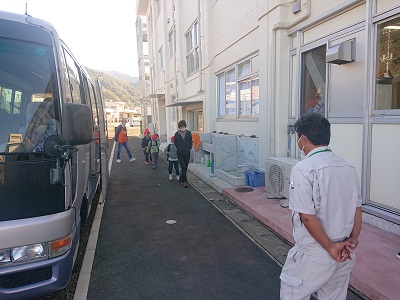 1年生は、本日「秋見つけ」として校外学習に出かけました。はかま滝、もてなしの里、御浜海岸に行ってきました。出発前にドライバーである用務員さんに「お願いします。」のあいさつをしてからバスに乗り込みました。