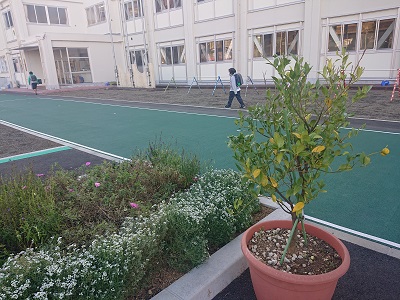 校舎北側にあるたちばなの苗木にたくさんの可愛らしい実がついています。
