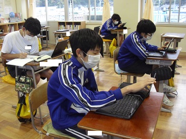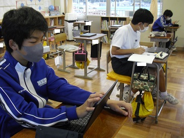 8年生の朝活動の様子です。Chromebook(クロームブック)を使って活動を進めるメンバーもいます。