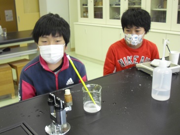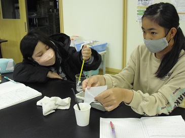 5年生は理科で「もののとけ方」について学習しています。今日は「溶ける量に限界はあるのか」という学習テーマで予想を出し合った後、検証実験を行いました。