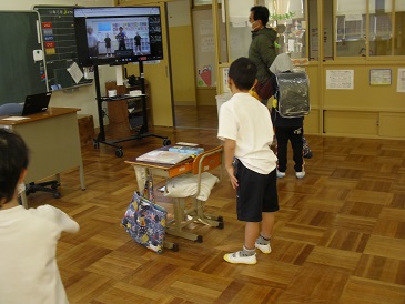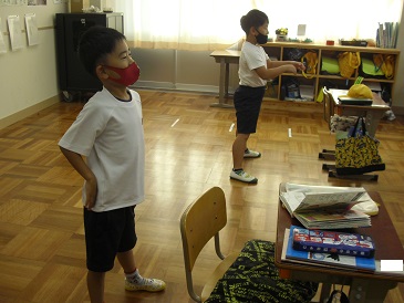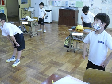 1年生の朝活動の様子です。健康委員会企画の「マッスルトレーニング」を楽しみました。