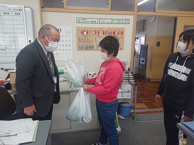 収穫した野菜を袋詰めにし、職員室に居合わせた教職員に野菜をプレゼントしていました。