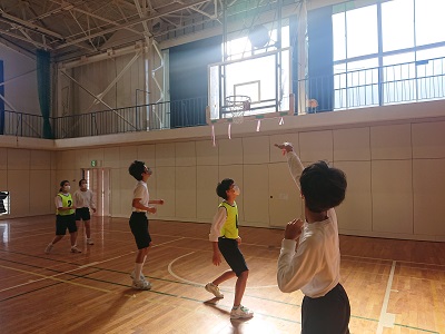 8年生は体育で「バスケットボール」を学習しています。3対3でゲームを行っていました。