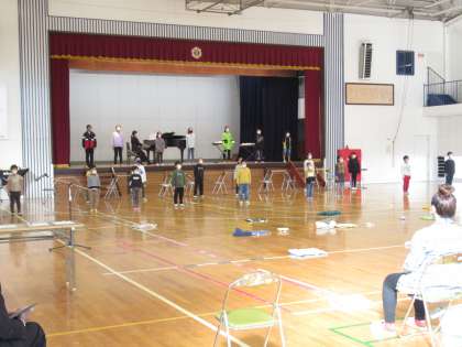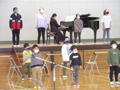 今日の授業参観では、初等部が音楽発表会を行いました。潮風祭文化の部が大人数で集まってできないため、今日は初等部のみの実施です。まずは全員で一貫学校の校歌を披露しました。