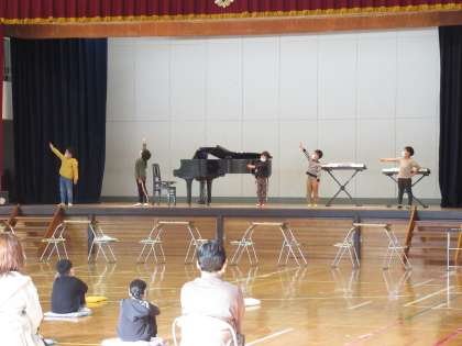 1年生の発表です。「じゃんけんぽん」を歌とカスタネットで、「しろくまのジェンカ」をカスタネットで披露しました。最後には「にじ」の歌を振りつきで表現しました。