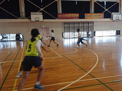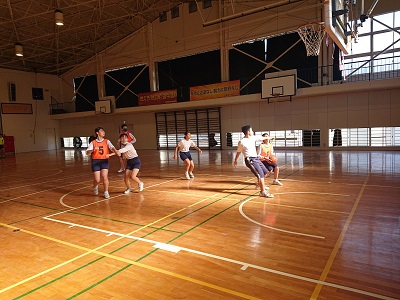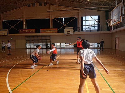 9年生は体育で「バスケットボール」を学習しています。3対3でゲームを行っていました。