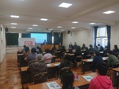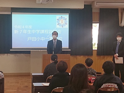 学校長あいさつの後、中学校生活について、生活面や学習面の話をしました。また、「メディアの上手な使い方」について、沼津警察署少年サポートセンターの方から講話がありました。