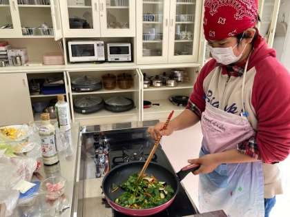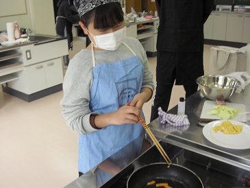 今日は、初の炒める調理なので、フライパンの使い方など安全指導を行ってから実習に入りました。