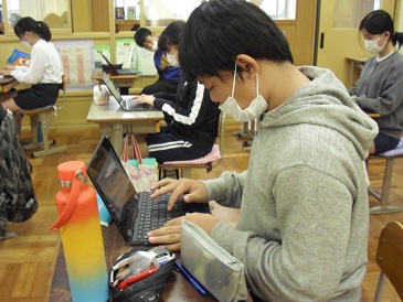 6年生は総合的な学習の時間において、防災学習を進めました。今日は、防災グッズには何を入れるのか等、Chromebook(クロームブック)を使って調べました。