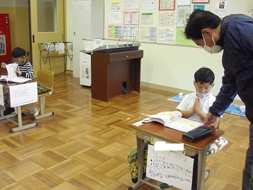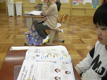 1年生は音楽で「旋律をつなげて遊びましょう」という教材を学習しています。「旋律づくり」として、最初に教員が鳴らす音を聞いていました。