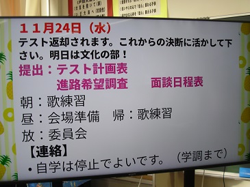 今朝の各クラスのお知らせです。黒板や大型提示装置を使って、子供たちに今日の情報を伝えています。