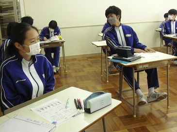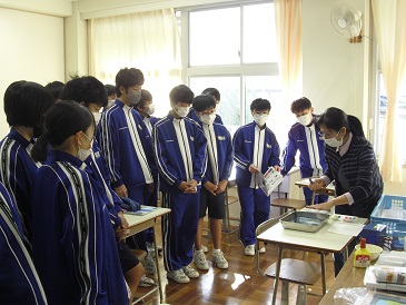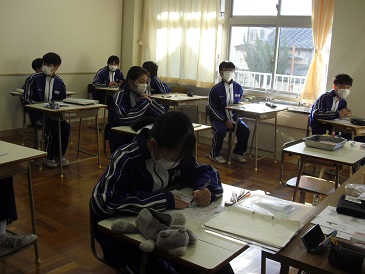 8年生は美術で「版画」について学習しています。マーブリング(墨流し)の手法について全体で確認しました。