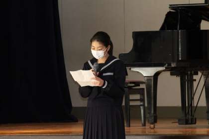8年生の実行委員が、合唱コンクールの審査のポイントや演奏上の注意を上手に述べました。