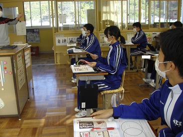 9年生は国語で「広告の読み比べ」という教材を学習しています。今日は、「二つの広告を比較して、ポスター作りに役立てよう」という学習課題のもと、活動を進めました。