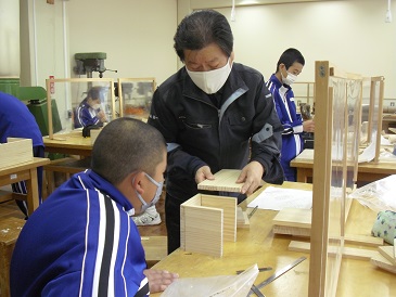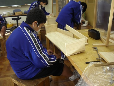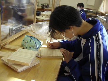 7年生は技術で「木材加工」について学習しています。今日は、のこぎりやかんなを使っての実習を行っていました。