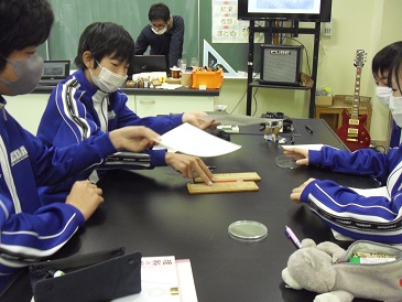 8年生は理科で「電流と磁界」について学習しています。今日は、「磁石の力とはどのようなものか」という学習課題のもと、予想を立てて検証実験を行いました。