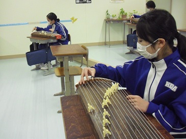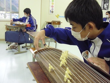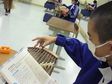 7年生は音楽で「日本の音楽に親しもう」という教材を学習しています。「箏のいろいろな奏法」について映像を見た後、実際に箏を使って、「さくらさくら」を演奏してみました。