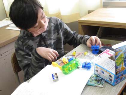 6年生は理科で「電流のはたらき」について学習しています。今日は、手回し発電機を使って、電気を作ったり、貯めたりする活動をしました。