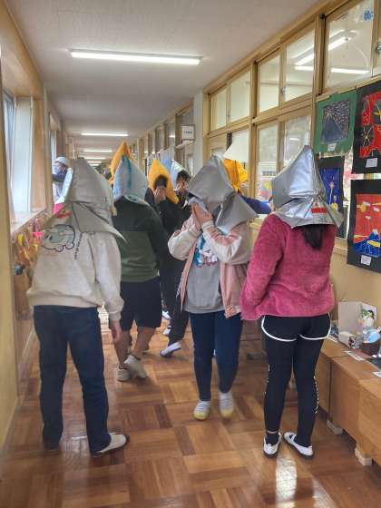 本日の昼休み、沼津南消防署戸田出張所の皆様と連携し、火災避難訓練を実施しました。2階理科室で出火という設定で、全員が東階段を利用しながら運動場に出ました。