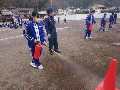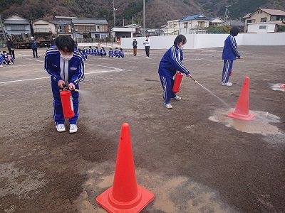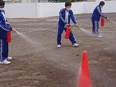 7〜9年生は、水消化器での消火体験を行いました。