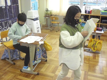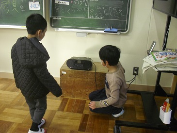 2年生朝の会の様子です。音楽係がCDデッキの操作をしていました。