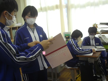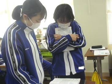 9年生は数学で「三平方の定理」について学習しています。今日は、円錐と角錐の高さの求め方について理解を深めました。ペアになって解答を共有していました。