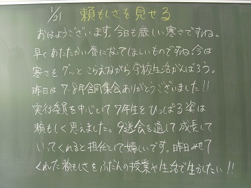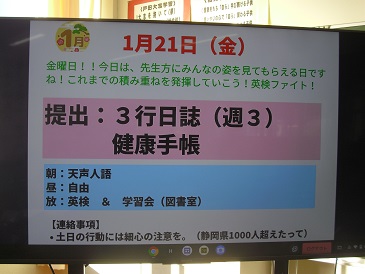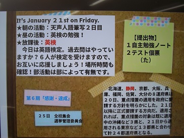 今朝の各クラスのお知らせです。黒板や大型提示装置を使って、子供たちに今日の情報を伝えています。