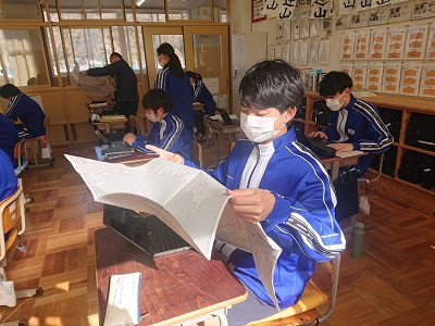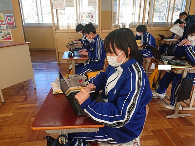 8年生は社会で「戸田小中一貫校区の特徴を地形図から読み取ろう」という学習をしています。方位及び土地・交通の様子から特徴を理解し、Chromebook(クロームブック)に考えをまとめました。