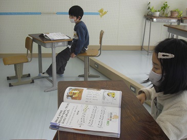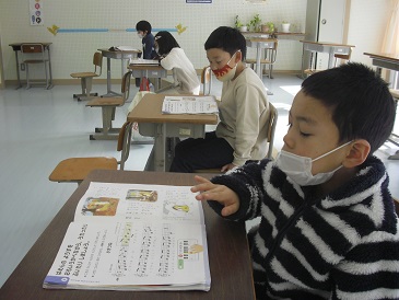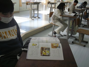 2年生は音楽で「様子を思いうかべよう」という教材を学習しています。場面の様子を思い浮かべながら、みんなで「こぎつね」の曲を聴きました。