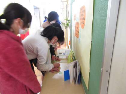 校長室前に「みんなでどう解く?」コーナーがあります。6年生が問題に答えていました。