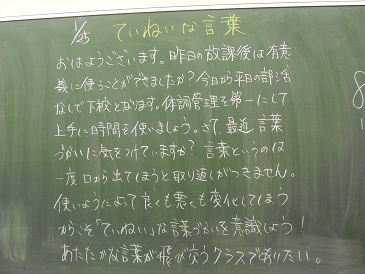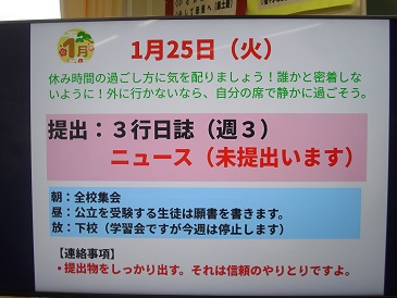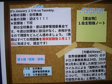 今朝の各クラスのお知らせです。黒板や大型提示装置を使って、子供たちに今日の情報を伝えています。