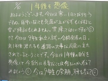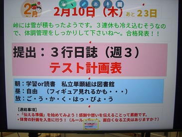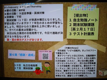 今朝の各クラスのお知らせです。黒板や大型提示装置を使って、子供たちに今日の情報を伝えています。