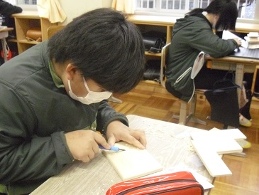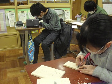 6年生は図工でオルゴール作りを行っています。今日は、オルゴールボックス上面の下絵を描いたり、彫刻刀で彫り進めたりしていました。