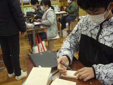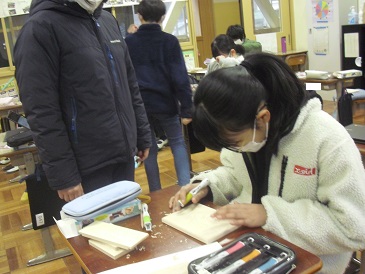 6年生は図工でオルゴール作りを行っています。今日は、オルゴールボックス上面の下絵を描いたり、彫刻刀で彫り進めたりしていました。