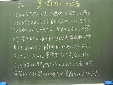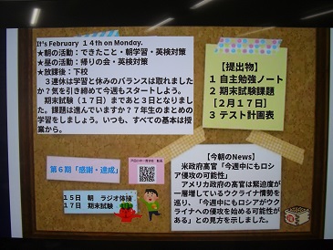 今朝の各クラスのお知らせです。黒板や大型提示装置を使って、子供たちに今日の情報を伝えています。