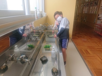 4年生が飼育中のカメさんの水槽をきれいに洗っていました。