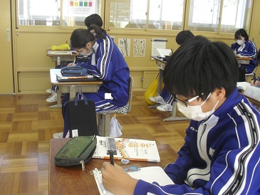 8年生は数学で「三角形・四角形」について学習しています。今日は、学年末テスト対策として演習問題に取り組んでいました。