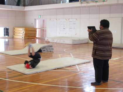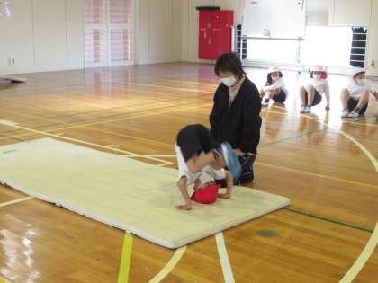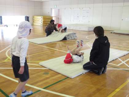 1・2年生は体育で「マット運動」を行っていました。個人個人の前転運動について、Chromebook(クロームブック)を使って撮影した後、どんな前転の仕方がいいのか、映像を見ながらみんなで振り返りました。
