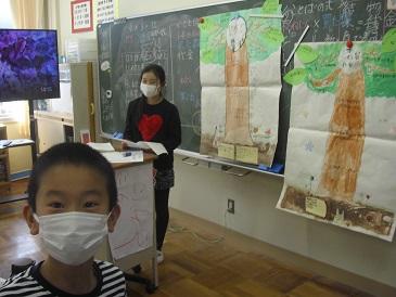 4年生は国語で「ドリームツリーを作ろう」という教材を学習しています。それぞれが作成したドリームツリーを使って、プレゼンテーションの準備や練習をしていました。