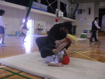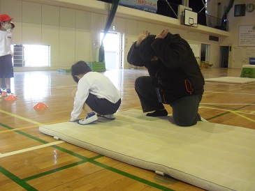 1・2年生は体育で「マット運動」を行っていました。個人個人の後転運動について、最初にビデオを視聴し、その後に実技を行いました。
