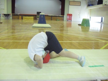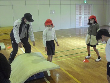 1・2年生は体育で「マット運動 〜後転〜」について学習しています。後転の仕方を覚えるために、マットの下に跳び箱の台を敷き、回転する感覚をつかめるようにしました。