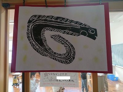 1年生校内美術展を2階1年教室前で行っています。みんなすてきな作品です。
