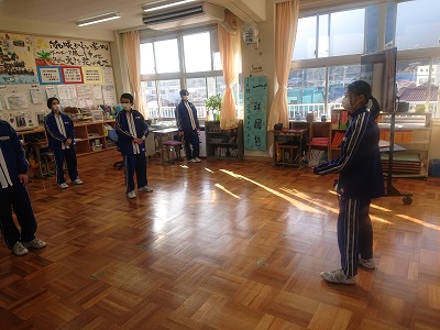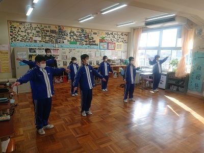 健康委員が声をかけ、クラスごとラジオ体操を行いました。みんなで一緒に体を動かしました。