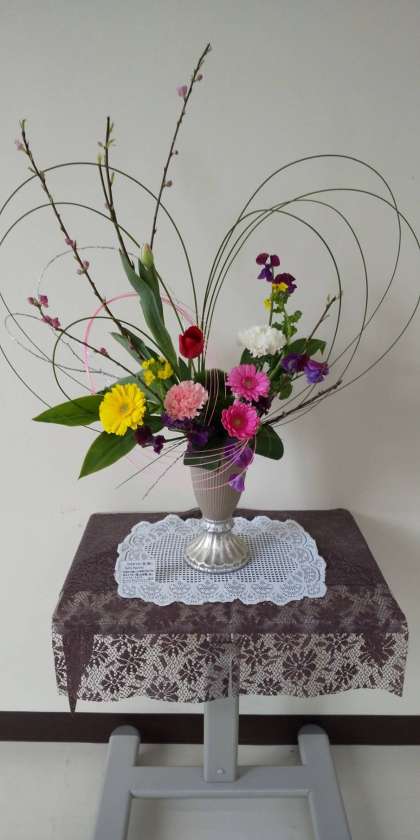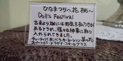 小池先生が、ヨーロピアンフラワーアレンジメント「ひなまつり 〜花桃〜」を児童生徒に見てもらえるよう準備をしました。明日は3月3日、ひなまつりです。