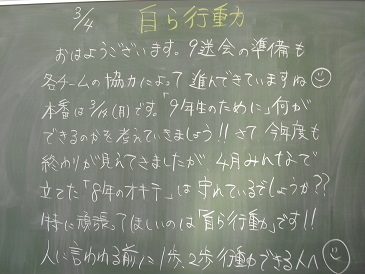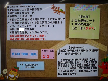 今朝の各クラスのお知らせです。黒板や大型提示装置を使って、子供たちに今日の情報を伝えています。