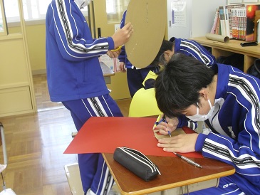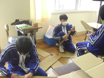 8年生は国語で「読書の広場 那須与一 −「平家物語」より」という教材を学習しています。グループごとに音読を交えた劇を行う予定です。今日はその準備をしていました。