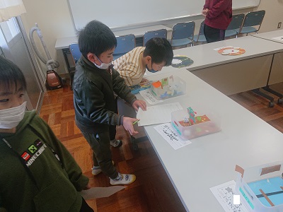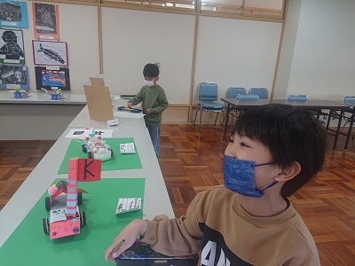 1年生は図工で「すてきな作品を見つけよう(鑑賞)」という学習を行っていました。会議室で開催中の「校内美術展(小学生)」の作品を鑑賞しました。