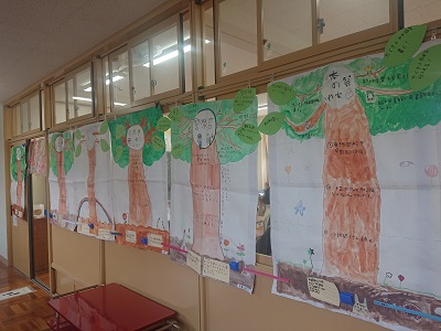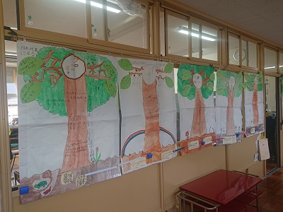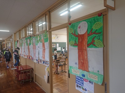 4年生は国語で「ドリームツリーを作ろう」という教材を学習しています。それぞれが作成したドリームツリー作品を廊下に掲示しました。
